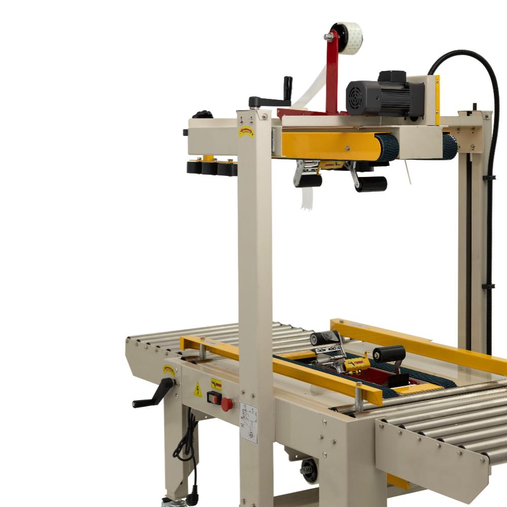 это мощное профессиональное оборудование для одновременной заклейки верхних и нижних стыков картонных коробов клейкой лентой (скотчем). Модель оснащена двумя парами конвейерных ремней (верхней и нижней), которые обеспечивают надежную протяжку коробов без перекоса. Заклейщик предназначен для предприятий пищевой промышленности, складских комплексов, распределительных центров и производств с высоким трафиком упаковки крупногабаритной продукции.